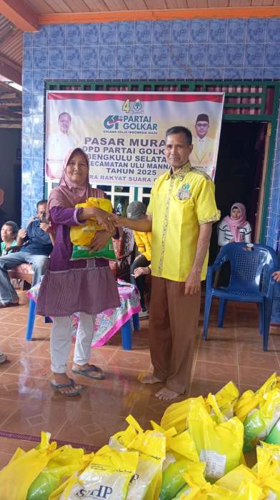 Kususnya hari ini DPRD Daerah pemilhan ll menjelang Hut partai Golkar ke 61 Untuk membantu warga masyarakat di Kabupaten Bengkulu Selatandi tiga Dapil 1,2 dan 3 terhadap kebutuhan pokok seperti beras dan minyak goreng,hari ini Selasa 7 Oktober 2025 segenap kepengurusan DPD Partai Golkar Bengkulu Selatan dan DPW Partai Golkar Propinsi Bengkulu mengelar Pasar Murah serta ke warga lasung melalui kepengurusan PK ( pengurus kecamatan) terutama kecamatan Ulu manna.